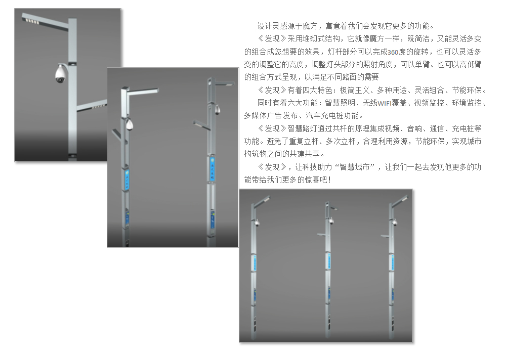 以大膽創(chuàng)新和前衛(wèi)思維設(shè)計的發(fā)現(xiàn)系列智能路燈,不僅體現(xiàn)智慧路燈的功能,還能魔方式組合,擁有不事張揚(yáng)的外形,低調(diào)中散發(fā)著源自發(fā)現(xiàn)的獨特氣質(zhì),穩(wěn)重的同時將豪華融入其中